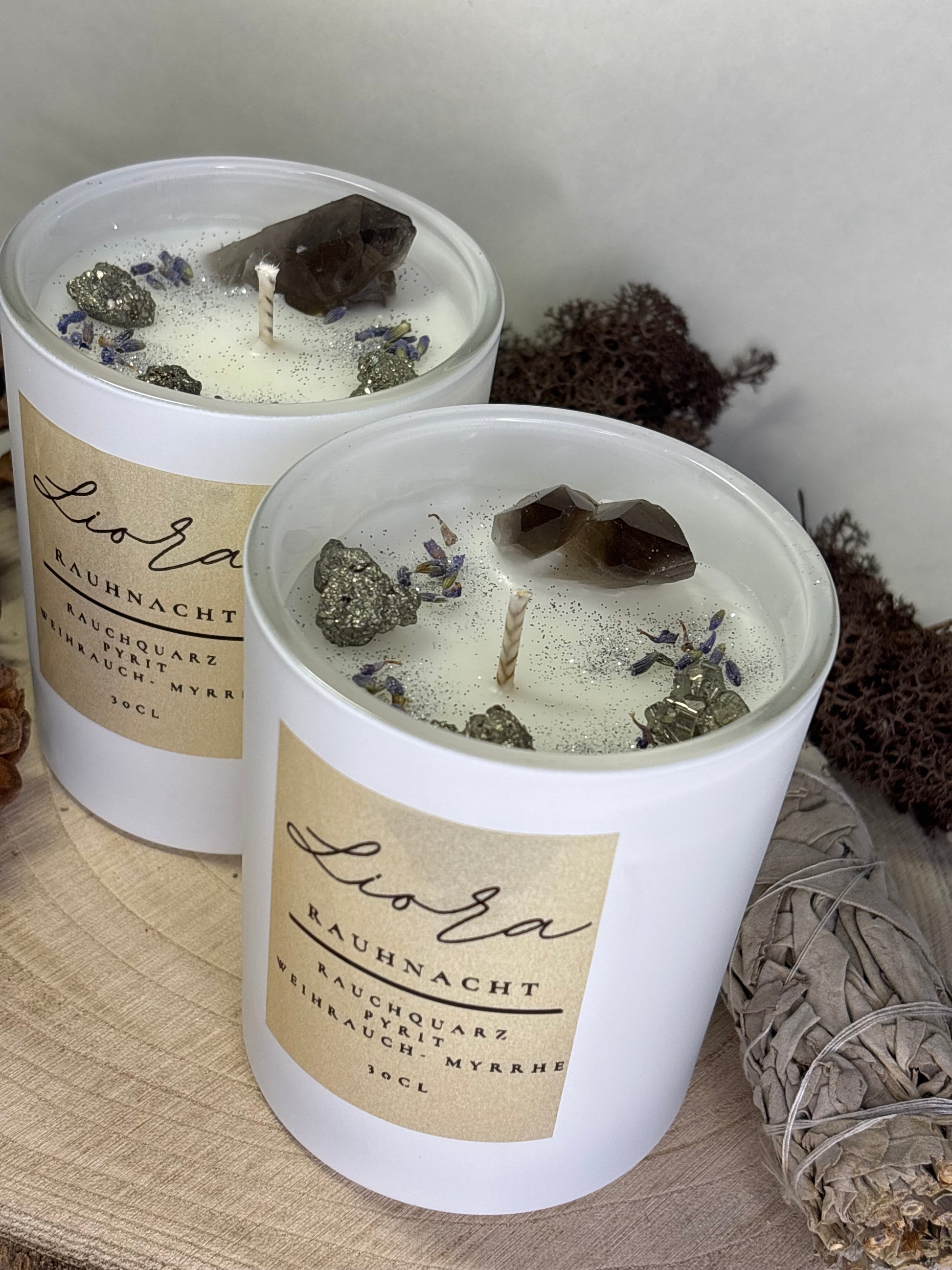 Diese besondere Raunachtskerze vereint die erdende Energie des Rauchquarzes mit der klaren, kraftvollen Ausrichtung des Pyrits. Rauchquarz unterstützt das Loslassen alter Energien und bringt Ruhe in die magische Zeit der Raunächte, während Pyrit Schutz, Fokus und Manifestationskraft stärkt. Gemeinsam schaffen sie ein harmonisches Feld aus Reinigung, Klarheit und Neubeginn, ideal für Rituale, Intentionen und die energetische Begleitung durch alle zwölf Raunächte.