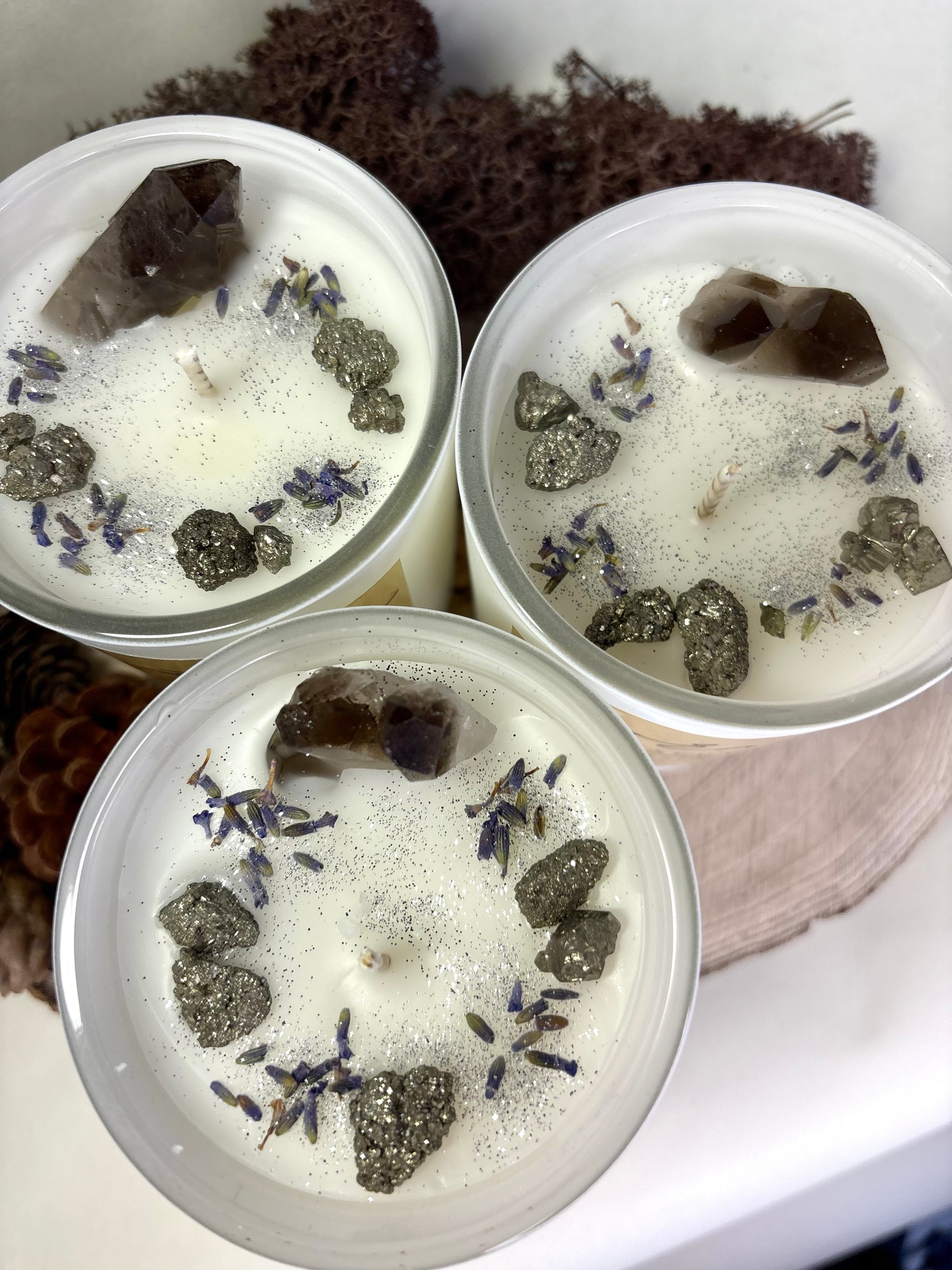 Mineralkerze aus 100% Sojawachs mit Rauchquarz & Pyrit Mineral und ätherischen Ölen